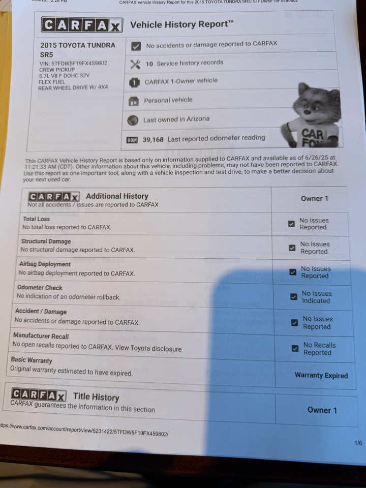 2015 TOYOTA TUNDRA SR5 TRD 5.7 V8 4WD/4X4 with Very low miles only 39k! All the service on the truck has been performed, no recalls! 1 owner truck, clean title, clean Carfax, new tires brakes new oil change and VA state inspected. navigation backup camera super clean truck in mint condition No dings no dints or any scratches. Truck runs and drives like new one. no rust everything still looks brand new. I would say this is the cleanest truck for the year in the country! We ship for free anywhere in USA and we don’t charge processing fees or taxes $44995 is out the door price at the dealership with temporarily tags…. For more information you can call me at 540-397-4440 thank you